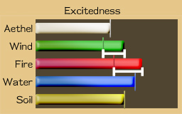 - Excitedness is the property when Fire Element and Wind Element are strong in Current Mass compared with Original Mass. It is aggressive and hyperactive state. It creates feelings of frustration and mixed up. SOUMA based on Excitedness have effects of attack which gives damages to the enemy.